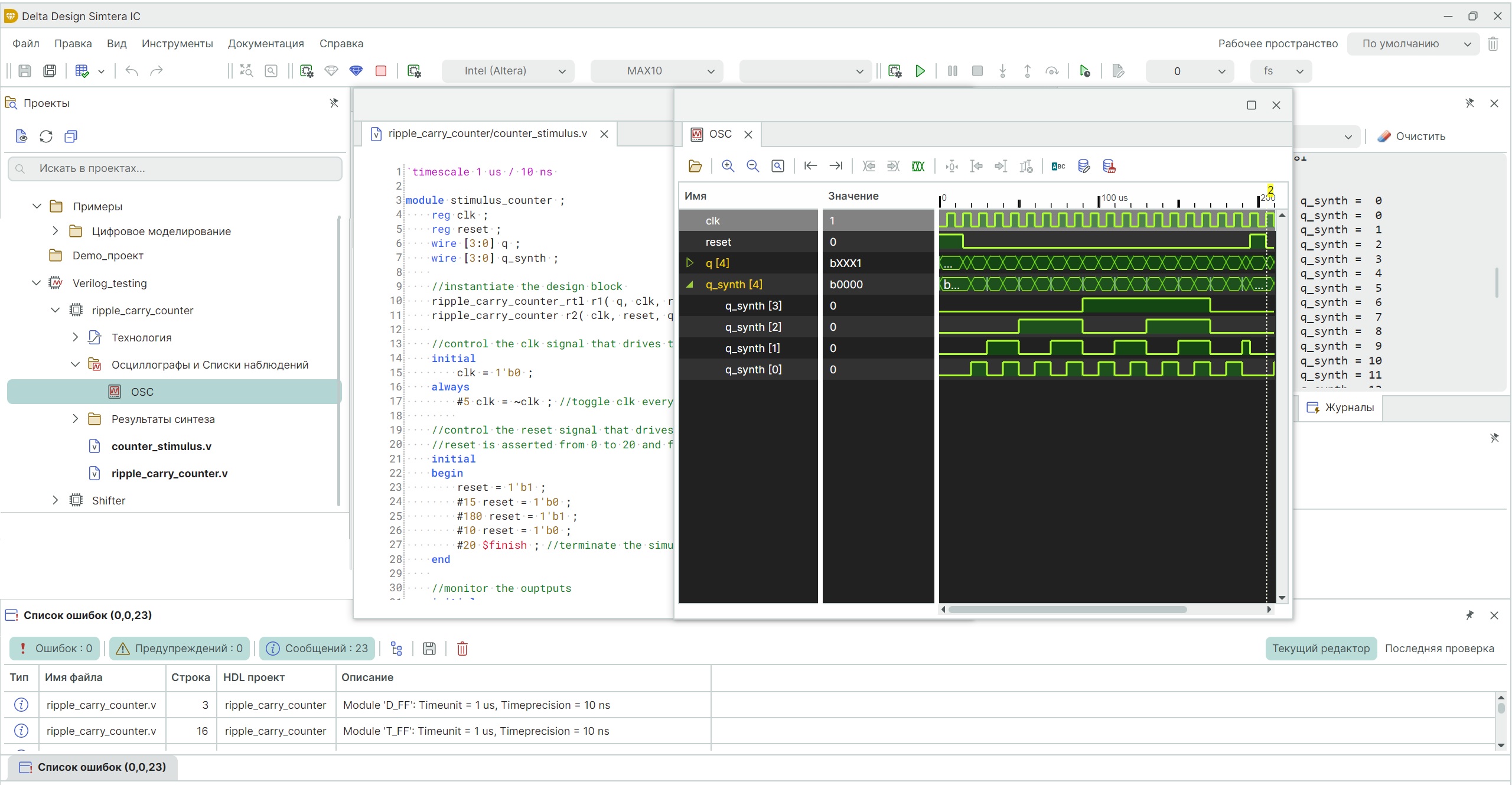 Следует отметить, что и моделирование и синтез производятся в единой среде проектирования, это избавляет разработчика