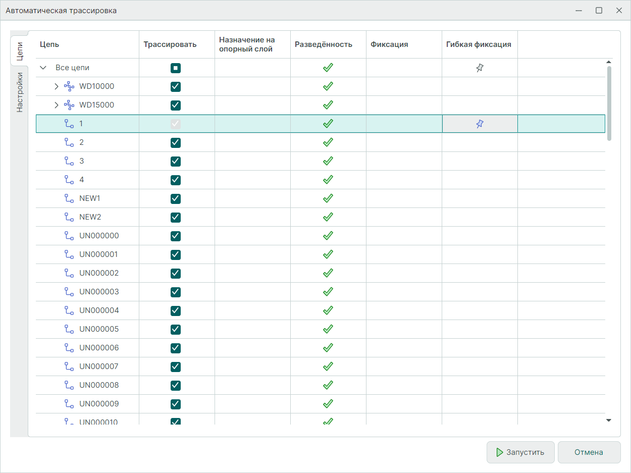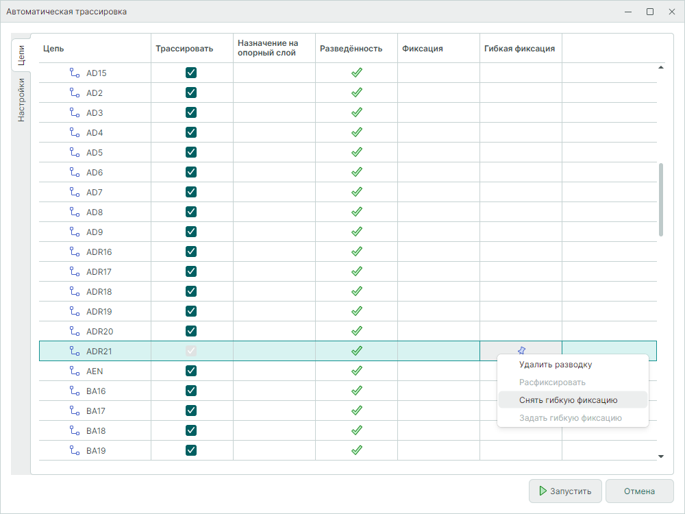 Задать цепь для гибкой фиксацией можно в окне "Автоматическая трассировка" в столбце "Гибкая фиксация" при выборе конкретной цепи (Рис. 1).