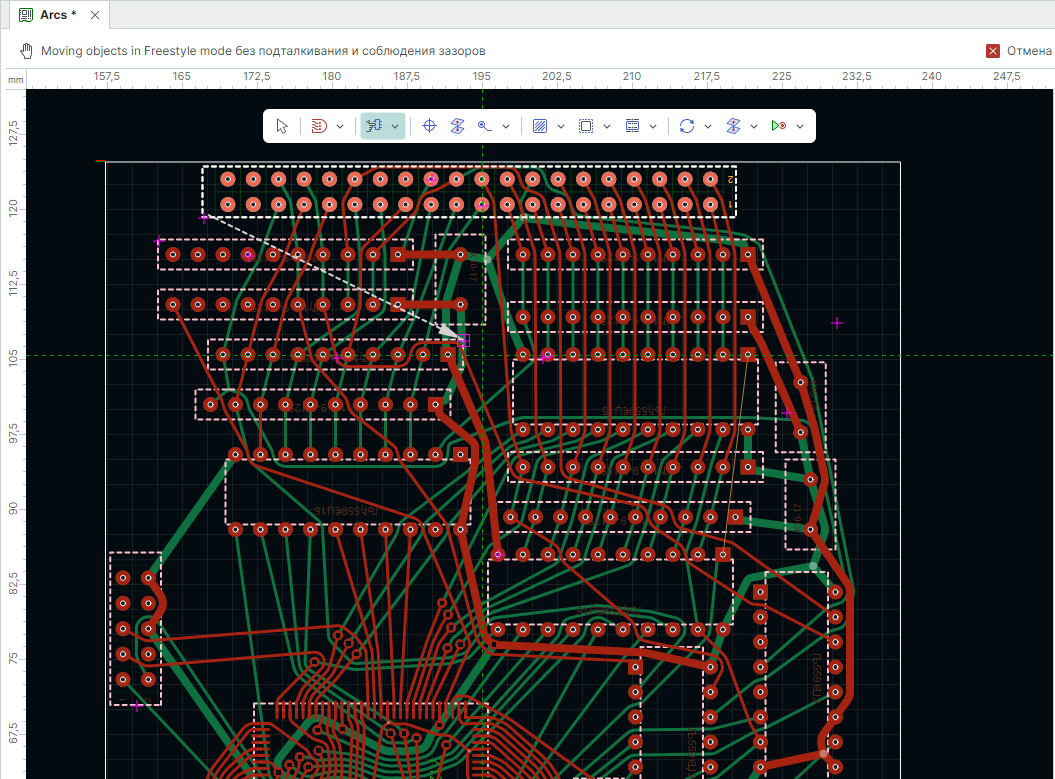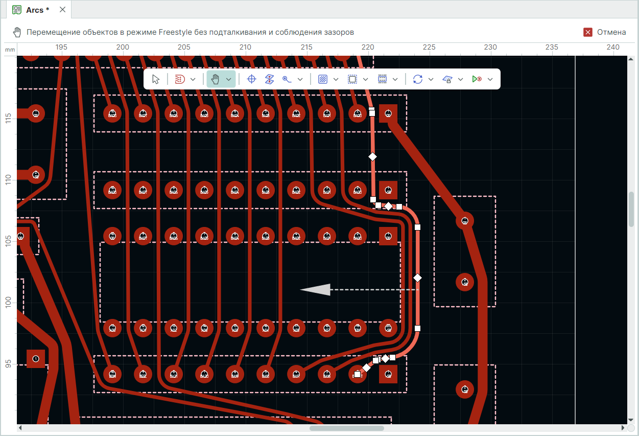 Совет! Режим перемещения "Freestyle" может применяться для улучшения топологии разведённой платы, созданной не только при помощи трассировщика "TopoR", но и любого другого. Оптимальная форма проводников после каждого перемещения вычисляется автоматически.