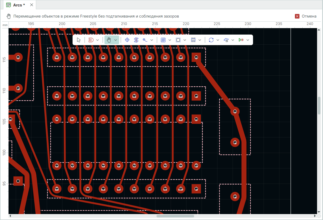 После переключения в режим "TopoR" на панели инструментов "TopoR" доступен режим для перемещения проводников "Freestyle".