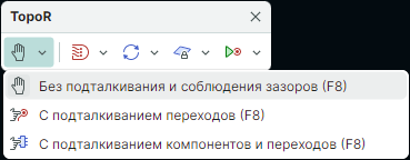 С подталкиванием компонентов и переходов – при перемещении объекта будут подталкиваться компоненты, переходные отверстия и точки ветвления проводников с соблюдением заданных зазоров.