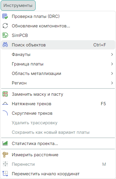 Вызов панели «Поиск объектов» при активном редакторе платы производится из главного меню «Инструменты» → «Поиск объектов» или сочетанием горячих клавиш «Ctrl+F» (Рис. 1).