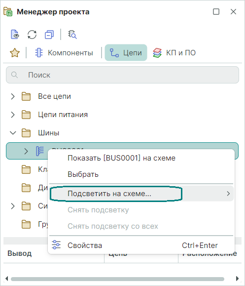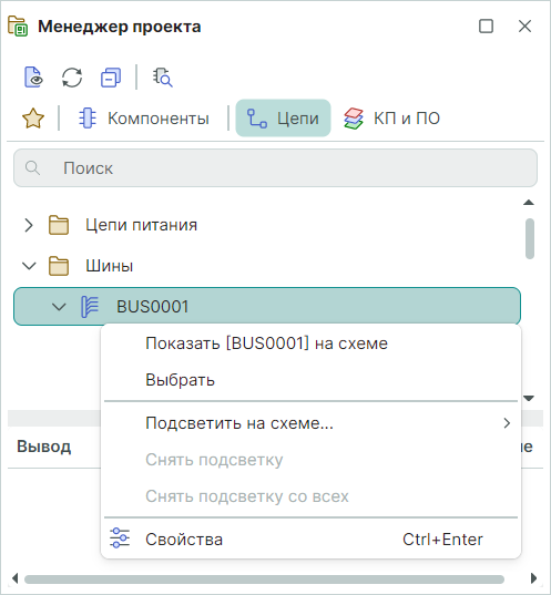 В панели "Менеджер проекта" → "Цепи" для выделенной шины доступен ряд функций (Рис.2).
