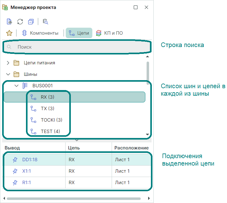 Внутри каждой шины в раскрывающемся списке показывается перечень цепей, определенных в данной шине.
