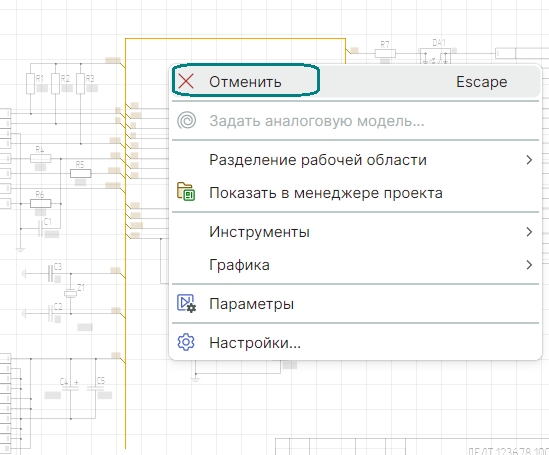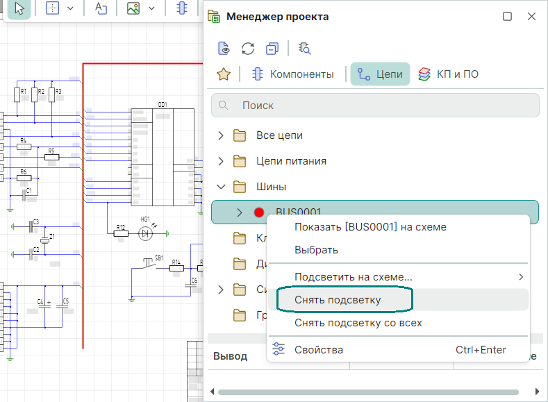 Чтобы снять подсветку, кликните в редакторе схемы по шине правой кнопкой мыши и из контекстного меню выберите пункт "Снять подсветку" или кликните в панели "Менеджер проекта" → "Цепи" по подсвеченной шине правой кнопкой мыши и из контекстного меню выберите пункт "Снять подсветку"(Рис. 6).