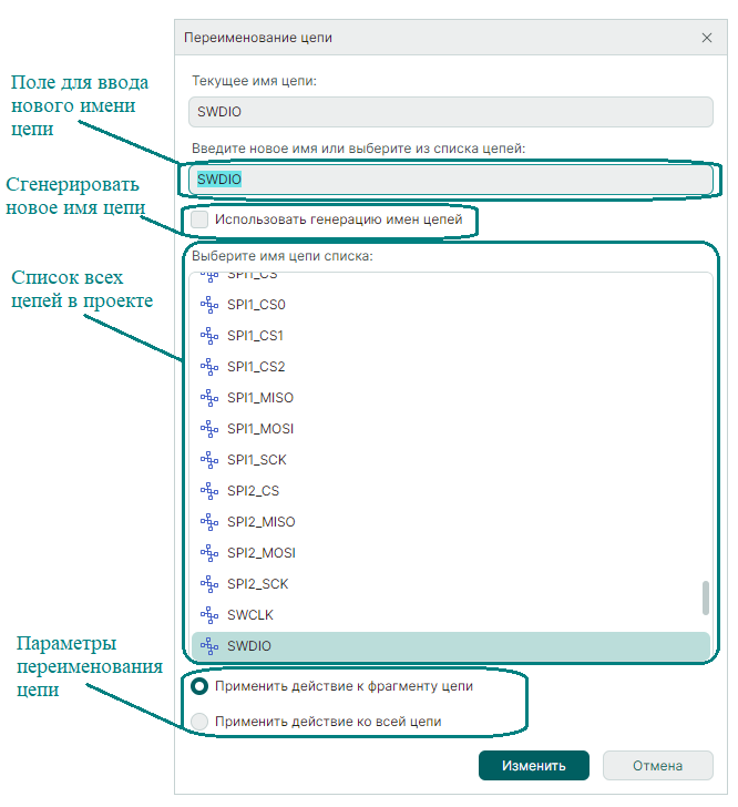 - при выборе пункта "Применить действие к фрагменту цепи" будет переименован только текущий проводник, а все же остальные проводники останутся в той же цепи, что и были. - Укажите новое имя цепи в форме переименования цепи и нажмите кнопку "Изменить".