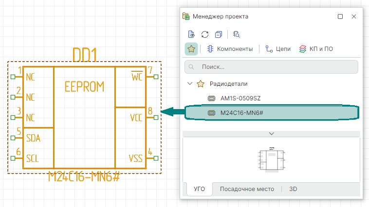 Как найти компонент и разместить его на схеме