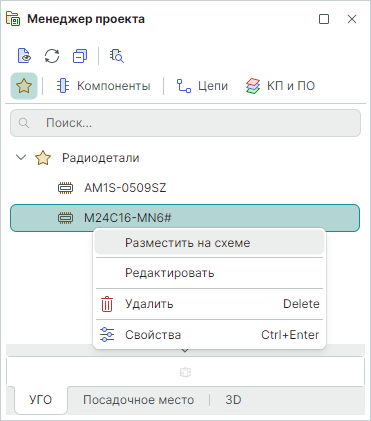После добавления радиодеталей в "Избранное", они будут доступны на панели "Менеджер проекта" в разделе "Избранное".