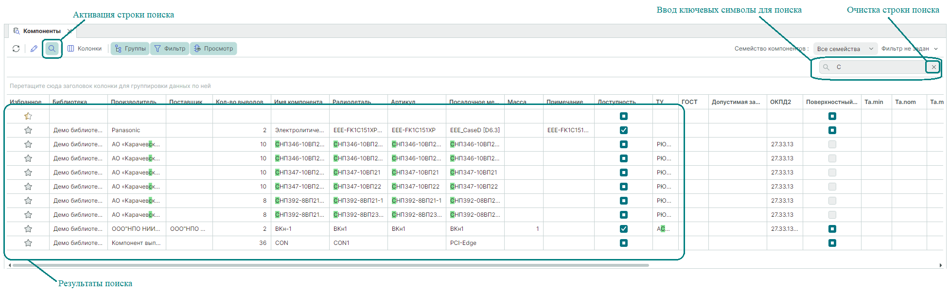 При этом появится строка поиска, в которую можно ввести ключевые слова для поиска радиодеталей. Поиск будет производиться по всем полям таблицы (Рис. 1).