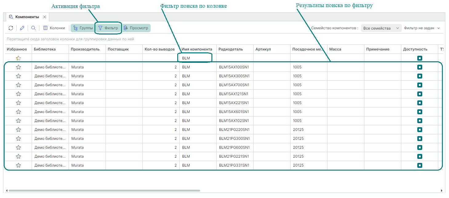 В панели "Компоненты" доступен фильтр поиска по каждой колонке таблицы. Для того чтобы сделать строку фильтра видимой, нажмите кнопку