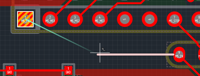 Если пользователь в процессе размещения трека уже зафиксировал некоторые его участки, то вместе со сменой сигнального слоя в точке расположения курсора будет добавлено переходное отверстие, и размещение трека продолжится уже на другом сигнальном слое, при этом сегменты до ПО будут располагаться на предыдущем сигнальном слое (Рис. 3, 4).