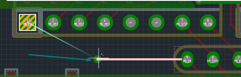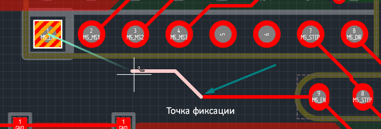 | Рис. 3 - Прокладка трека на текущем слое с точкой фиксации (Шаг 1) | Рис. 4 - Прокладка трека через ПО при переключении слоя (Шаг 2) |