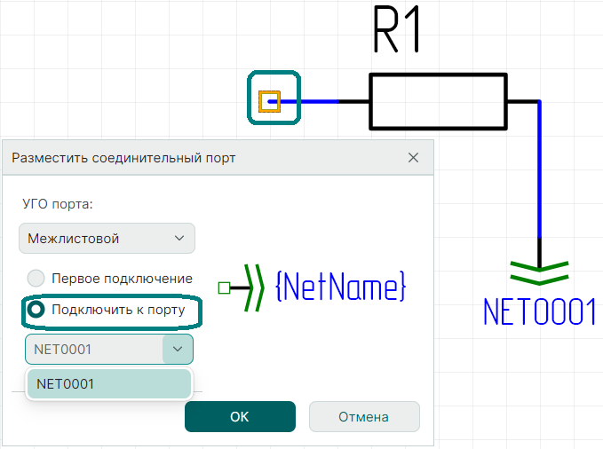 4. Выбрав необходимые параметры, нажмите "OK". Вместо символа свободного вывода цепи будет отображаться соединительный порт (Рис. 6).