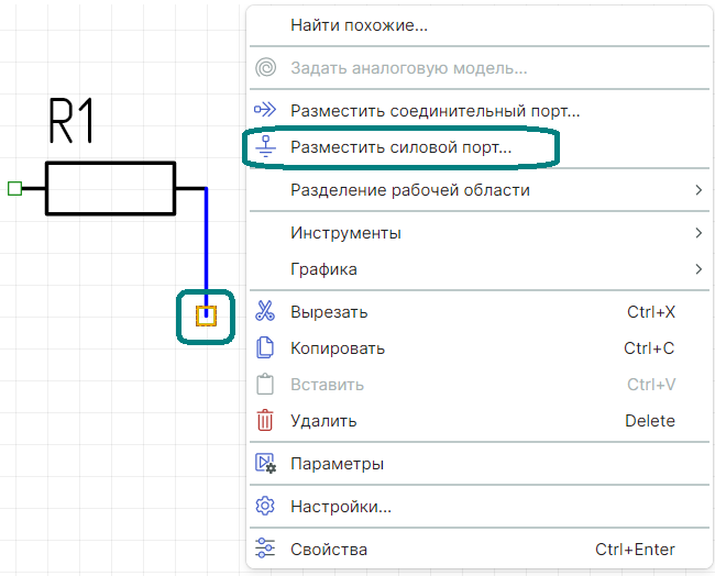 2. Нажмите правую кнопку мыши и из контекстного меню выберите пункт "Разместить силовой порт" (Рис. 1).