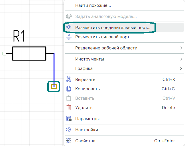 1. Выделите символ свободного вывода цепи, к которому надо присоединить соединительный порт.