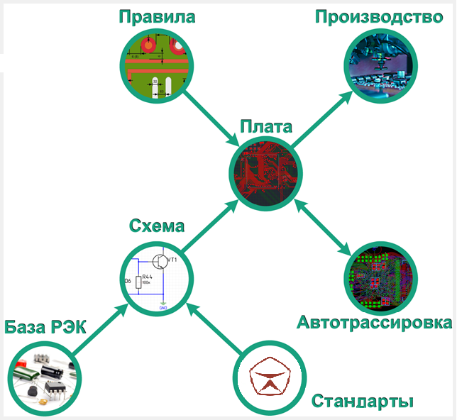 Все данные о печатной плате ведутся в рамках одного проекта. В рамках проекта разрабатываются схема и плата, ведутся правила проектирования. Выпуск документации осуществляется также в рамках проекта. Проект создается с использованием стандартов оформления документации, шаблонов правил проектирования и шаблонов слоев платы. Проекты могут экспортироваться и импортироваться.