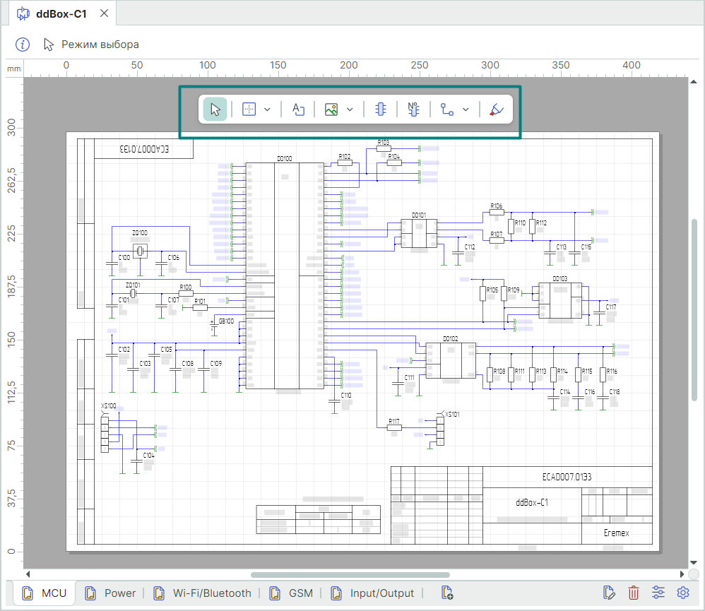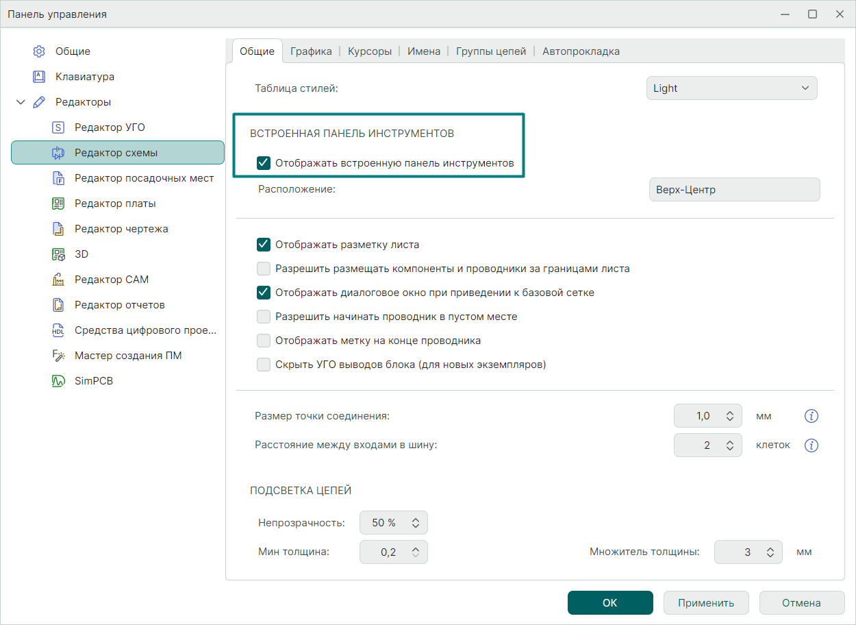 В нашем примере мы отобразили форму "Редактор схемы" с флагом в чек-боксе "Общие" → "Отображать встроенную панель инструментов" для отображения встроенной панели инструментов в редакторе схемы, смотри Рис. 5.