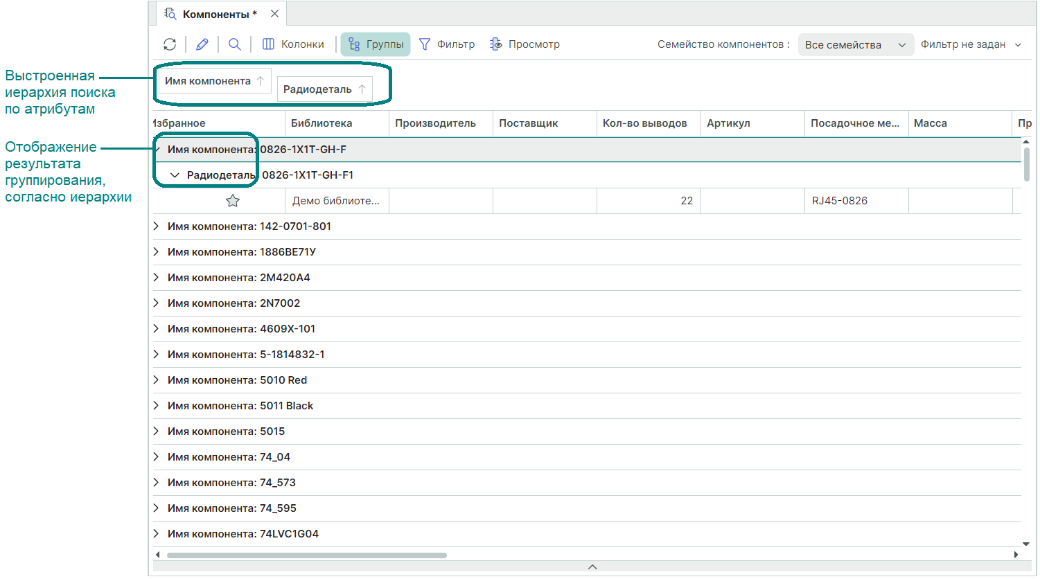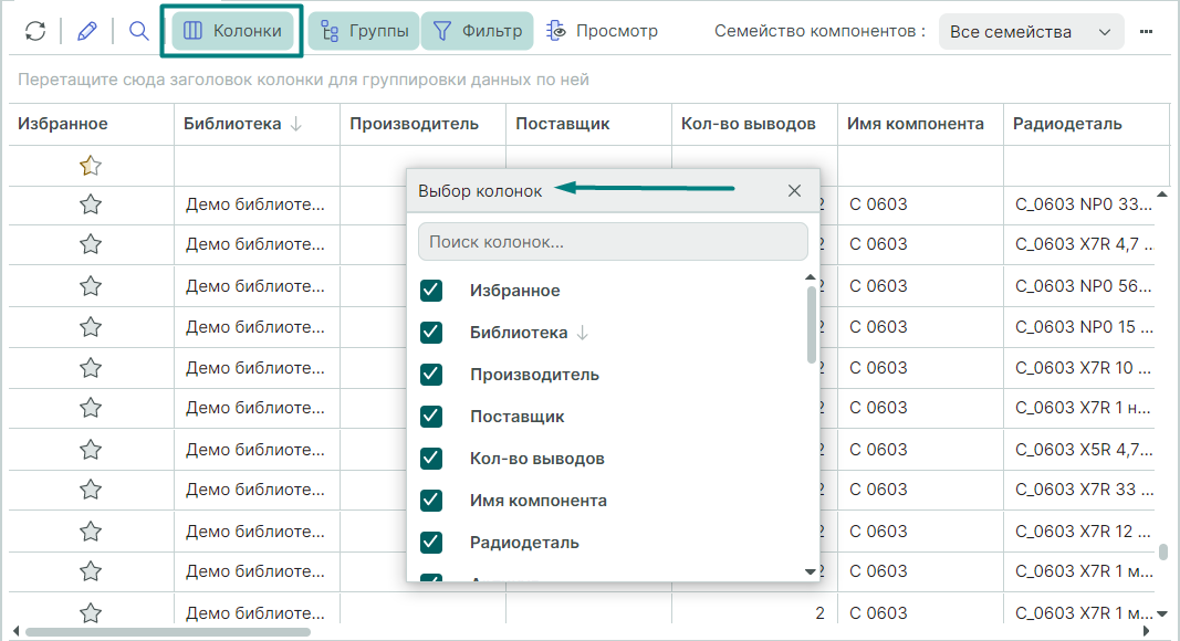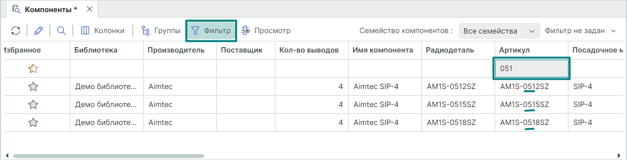 При этом в таблице будут показаны компоненты только указанного семейства.