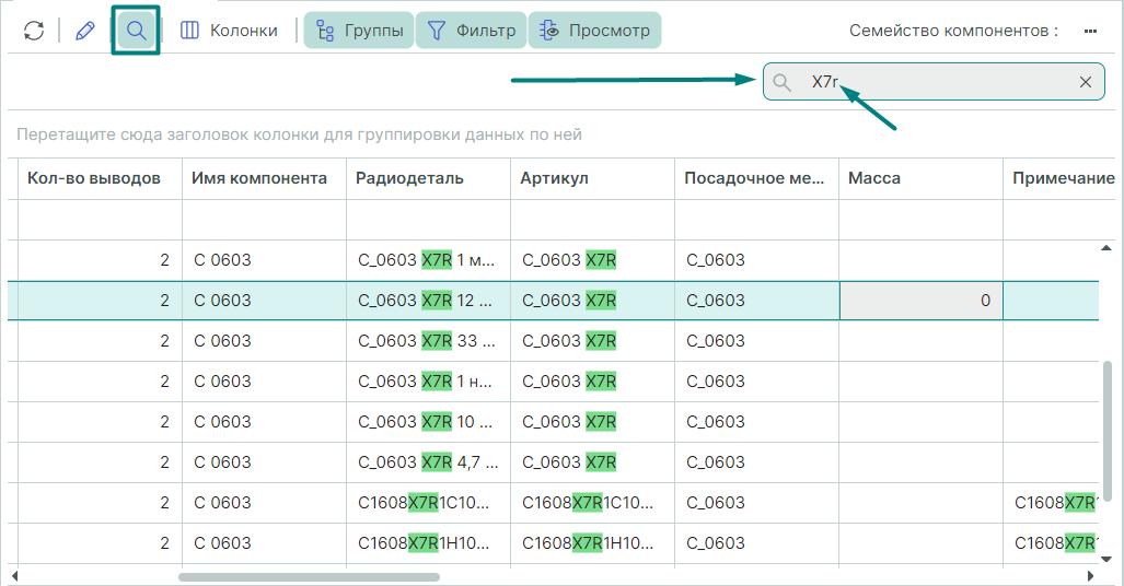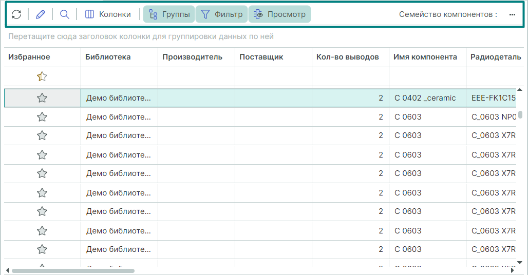 , над таблицей радиодеталей отобразится область, для формирования массива с перечнем колонок для группирования (Рис. 9).