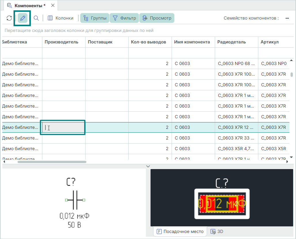 Область выбора радиодеталей – это основная область панели «Компоненты». В этой области отображается таблица радиодеталей, входящих в состав компонентов. Колонки таблицы – это перечень атрибутов семейств, реализованных в системе Delta Design. На пересечении выделенной строки и колонки отображает атрибут выделенной радиодетали.