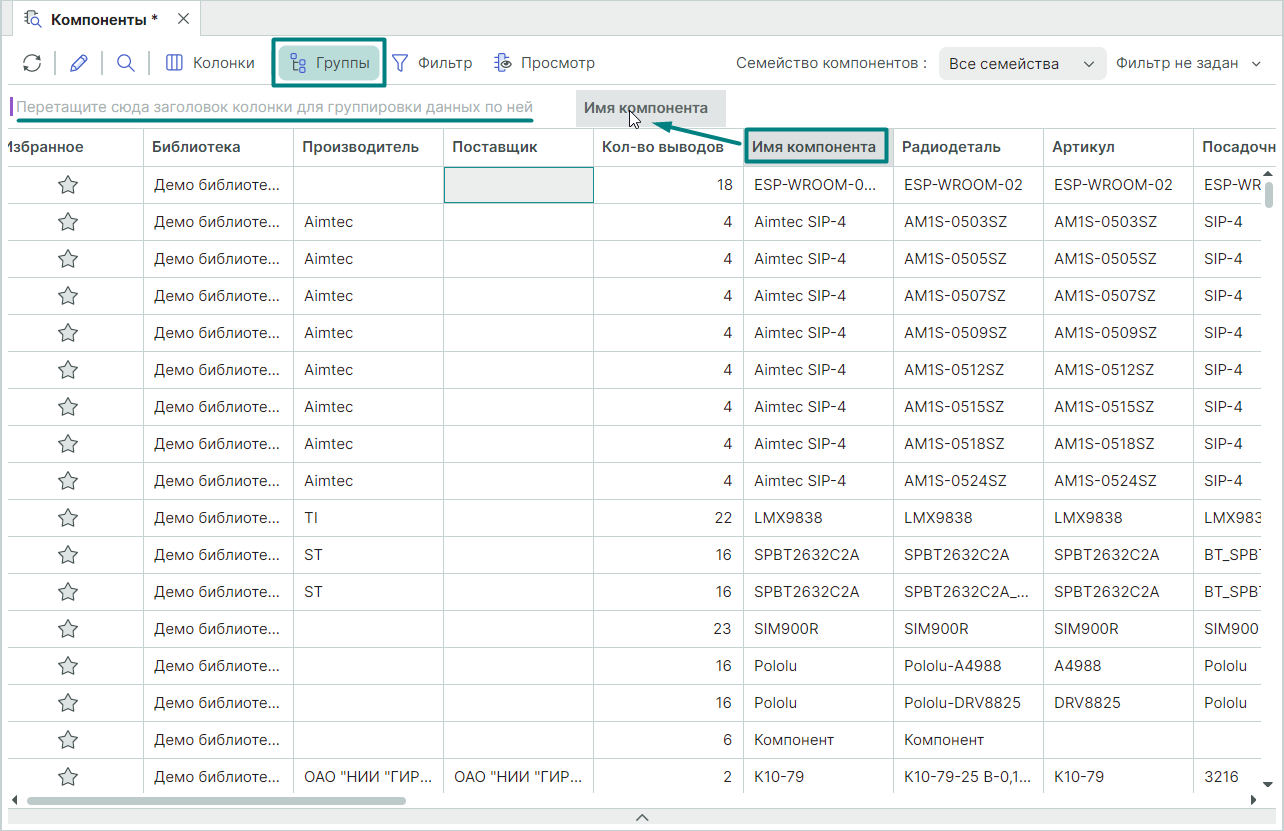 В панели "Компоненты" есть возможность сгруппировать данные таблицы по определенным атрибутам.