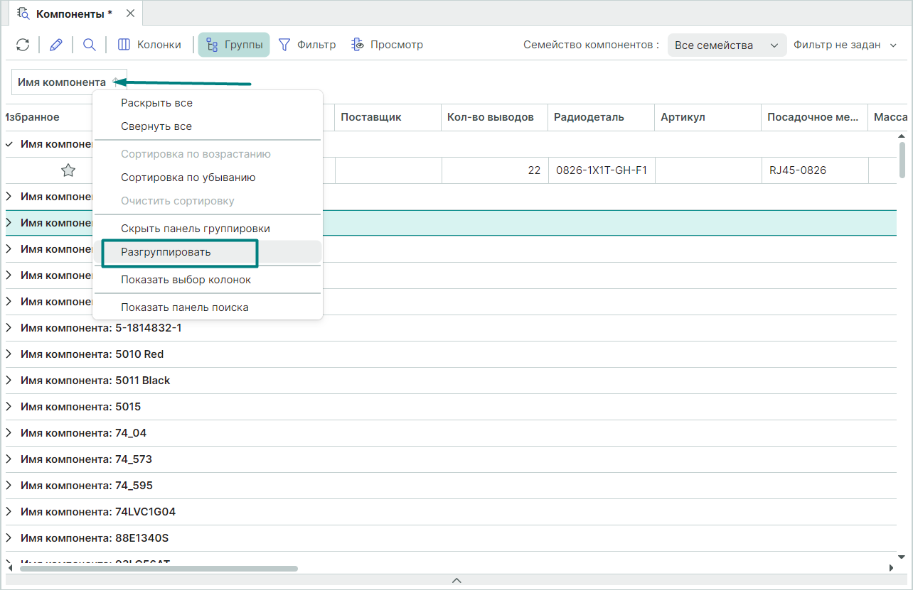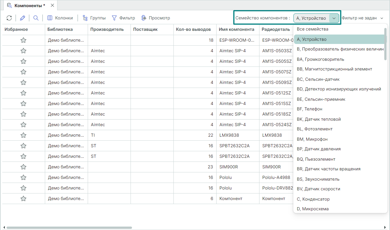 Все данные таблицы могут быть отсортированы, помимо прочего, по семейству компонентов. Для этого раскройте выпадающий список в поле "Семейство компонентов" и выберите требуемое семейство компонента (Рис. 14).