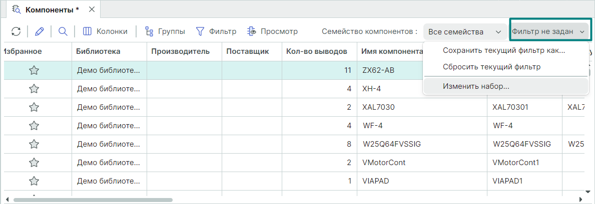 В панели "Компоненты" существуют инструменты по работе с настроенными фильтрами поиска. Для доступа к этим инструментам раскройте выпадающий список в поле "Фильтр не задан" (Рис. 15).