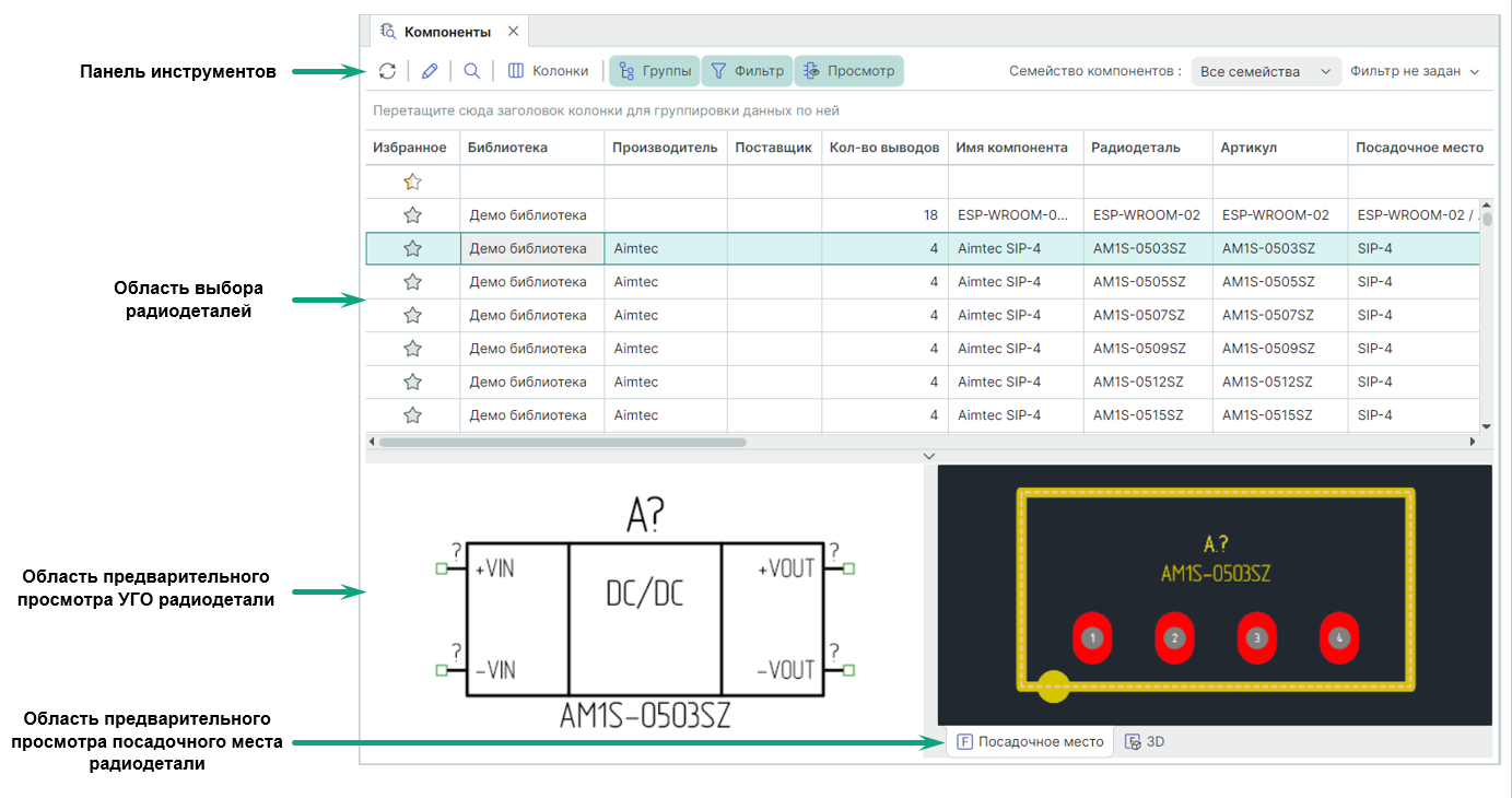 Перечень отображаемых радиодеталей строится на основе всех библиотек, имеющихся в системе – отображаются все радиодетали всех компонентов, расположенных во всех библиотеках системы. Если компонент содержит ошибки в своем описании, то радиодетали данного компонента не будут отображены в панели «Компоненты».