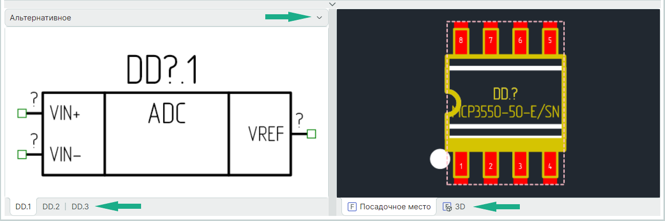 В области просмотра УГО компонента доступен выбор альтернативного представления (если их несколько), а также отображается список вкладок с секциями выбранного представления, в области просмотра графики посадочного места отображается список закладок с посадочными местами, которые подключены к данному компоненту (Рис. 13).