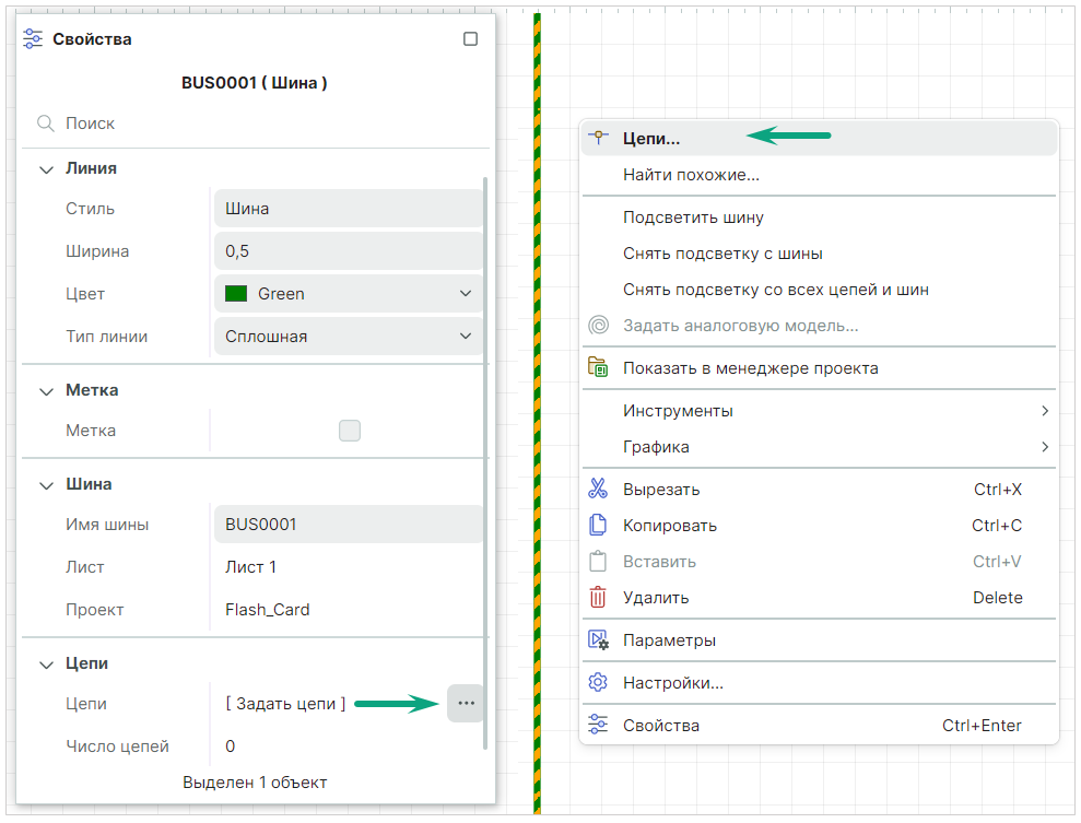 - в поле "Цепи" при выделении сегмента шины, отображается кнопка