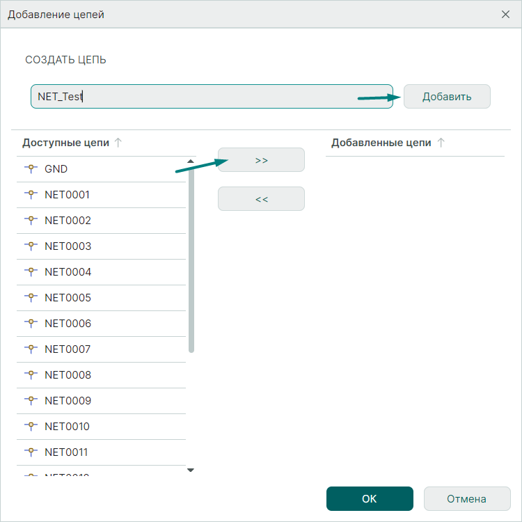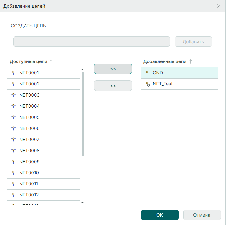 . Цепь будет добавлена в список "Добавленные цепи", в нашем примере это цепь "NET_Test" (Рис. 23б).