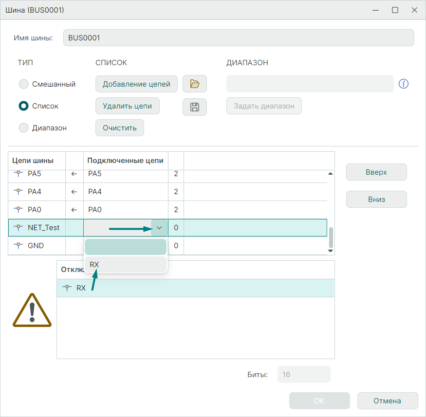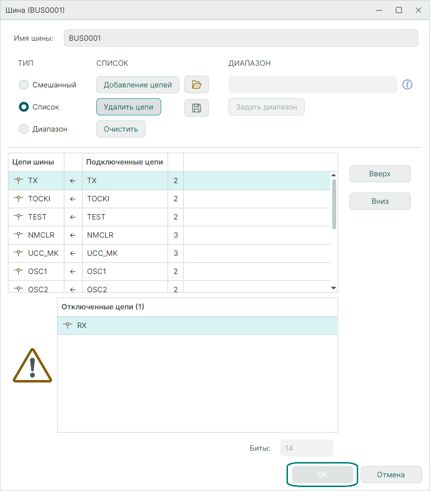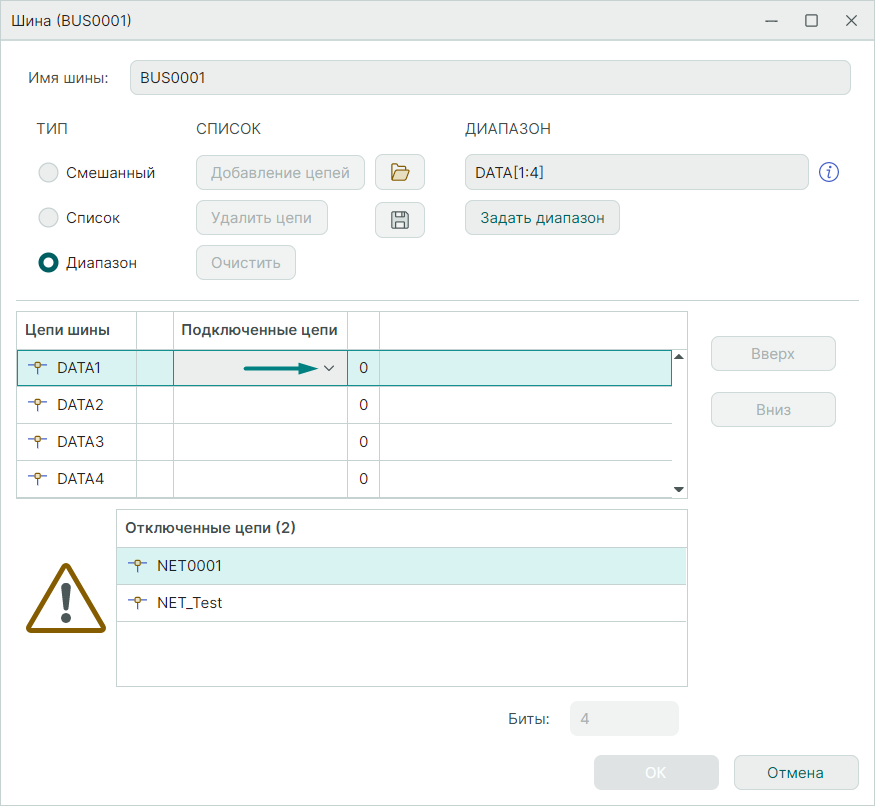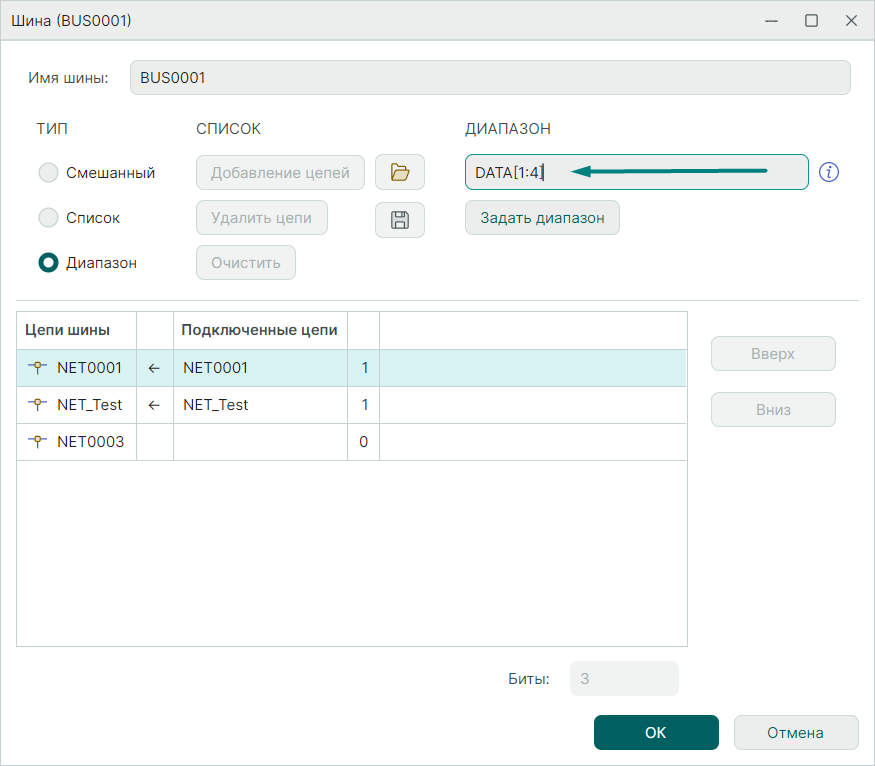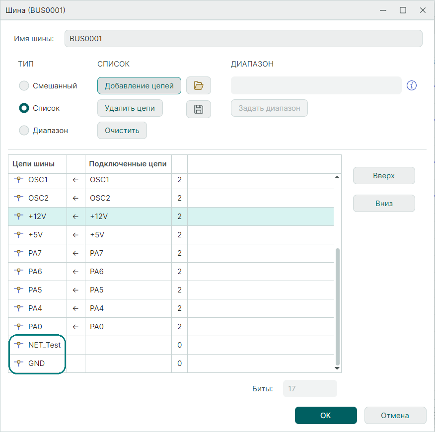 В режиме «Диапазон» также имеется возможность добавить в шину цепи, которые на данный момент отсутствуют на схеме или к шине еще не подключены.