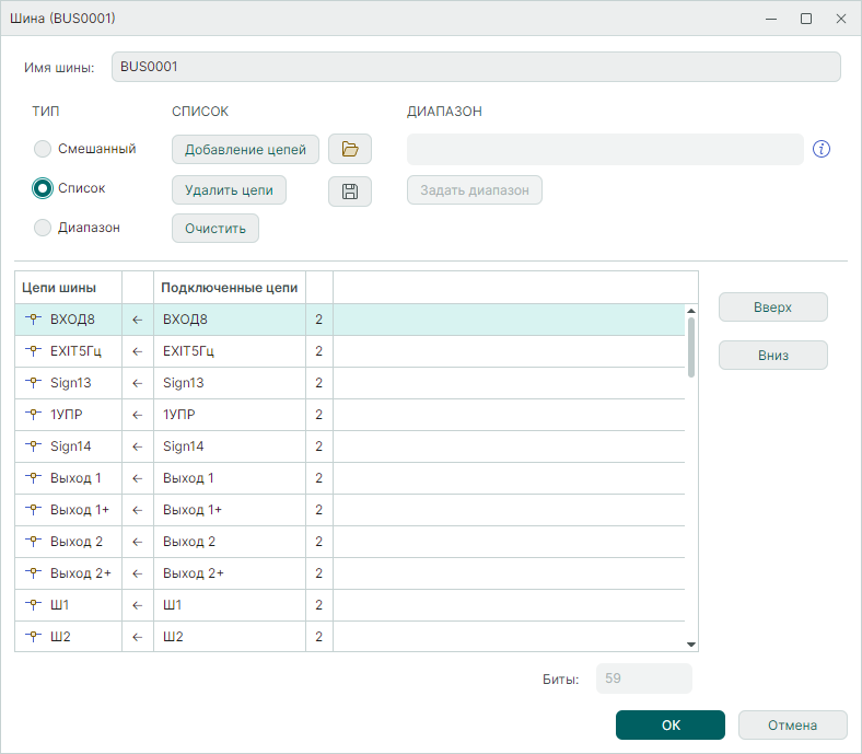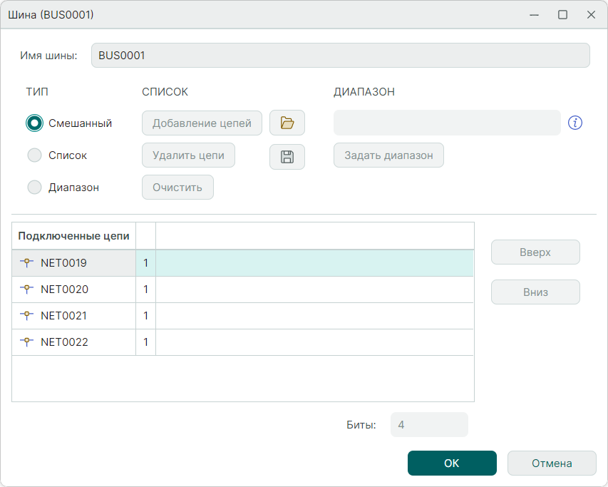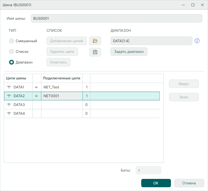 В нижней части окна в поле «Биты» отображается количество цепей, входящих в шину.