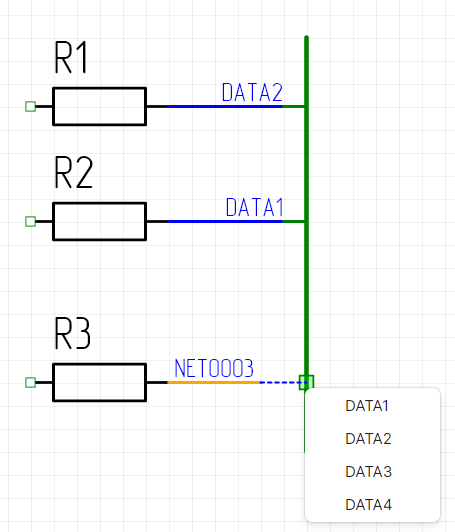 Если подсоединяемая к шине цепь имеет имя, совпадающее с одним из определений цепей в шине, контекстное меню показано не будет и соединение произойдет автоматически.