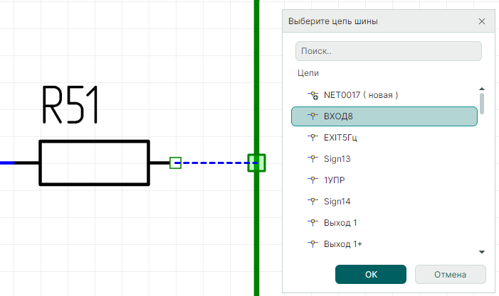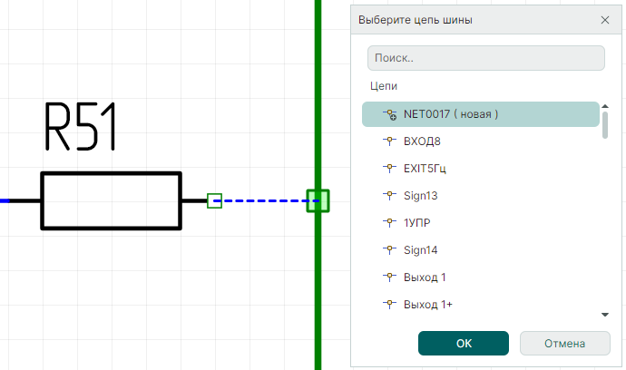 если выбрать создание новой цепи, в нашем примере пункт "NET0017 (новая)" (Рис. 19), то в шину будет добавлена новая цепь;