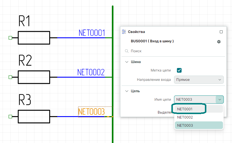 В нашем примере, если в поле "Свойства" → "Цепи" → "Имя цепи" выбрать NET0001, то в результате компонент схемы R1 и компонент схемы R3 объединятся одной цепью NET0001.
