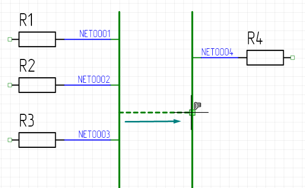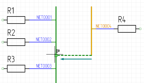 При размещении новой шины, она может иметь в качестве конечной точки другую шину на схеме (Рис. 29). При этом новая шина получит имя существующей.