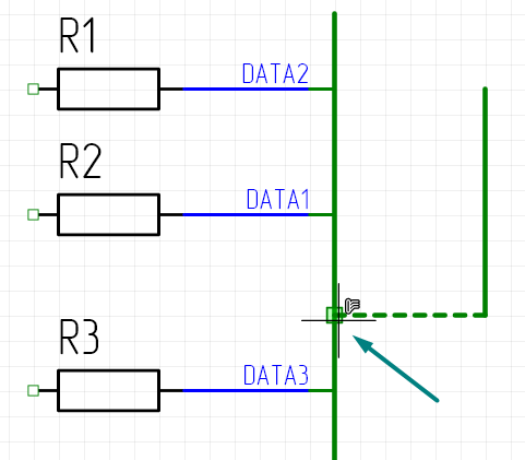 - в качестве начальной точки указать точку вывода объекта схемы, затем в качестве конечной точки подключения цепи указать точку на шине;