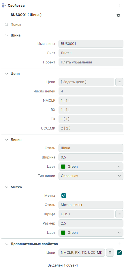 При выделении сегмента шины, в панели "Свойства" отображаться набор свойств (Рис. 10).