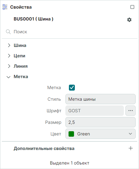 - "Метка" – при выделении сегмента шины, будет отображаться поле "Метка". Если поставить флаг в этом поле, то у сегмента будет показываться текстовая метка, содержащая имя шины. В данном разделе можно управлять параметрами стиля метки шины.