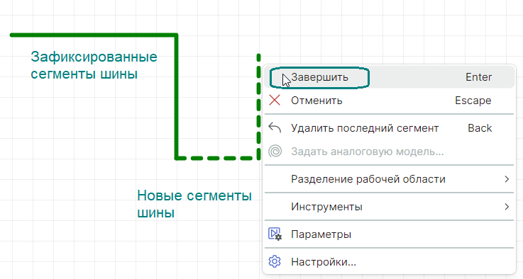 4. Для завершения рисования шины, нажмите правую кнопку мыши и в контекстном меню выберите пункт "Завершить". При этом все зафиксированные участки шины сохранятся, инструмент будет доступен для размещения новой шины.