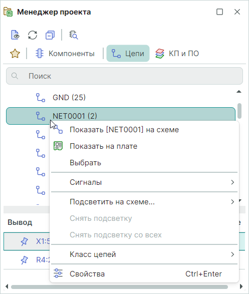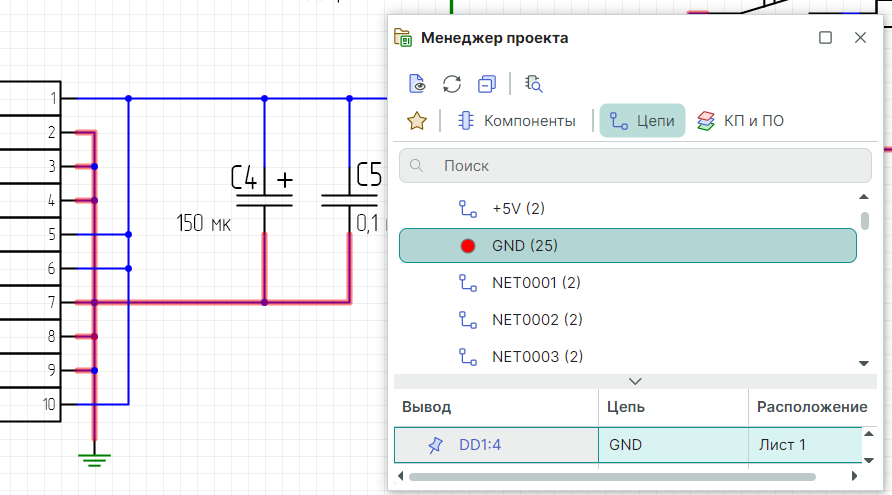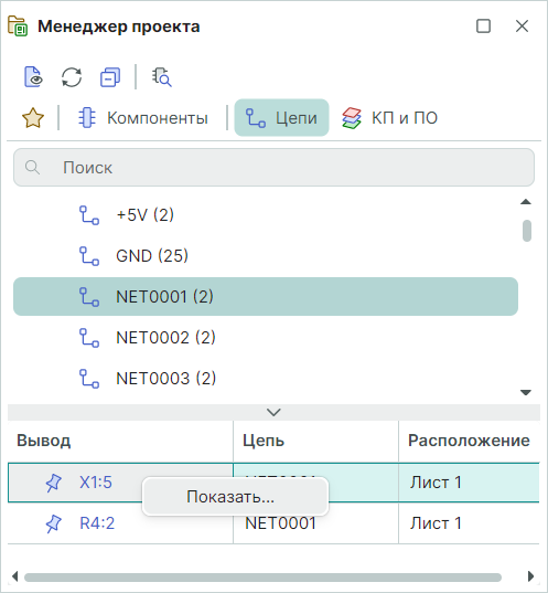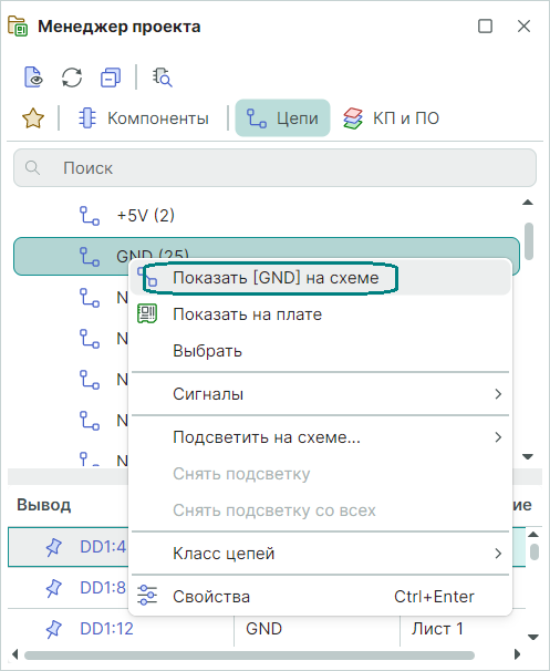 При выборе цепи в панели "Менеджер проекта" → "Цепи" в нижней части панели отображается таблица с информацией о выводах компонентов, к которым эта цепь подключена.