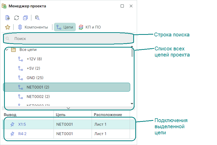 В верхней части панели отображается строка поиска для быстрой навигации по всем цепям и компонентам проекта.