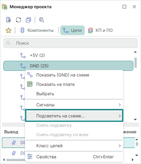 Чтобы подсветить цепь на схеме, можно также дважды кликнуть на ней левой кнопкой мыши в панели "Менеджер проекта".