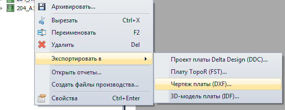 Прежде всего сохраните все изменения в редакторе плат Delta Design. Для того, чтобы вызвать форму экспорта в формат DXF, раскройте в панели навигации узел проекта, кликните правой кнопкой мыши на элементе "Плата", выберите в контекстном меню пункт "Экспортировать в" –> "Чертеж платы (DXF)" (Рис. 1).