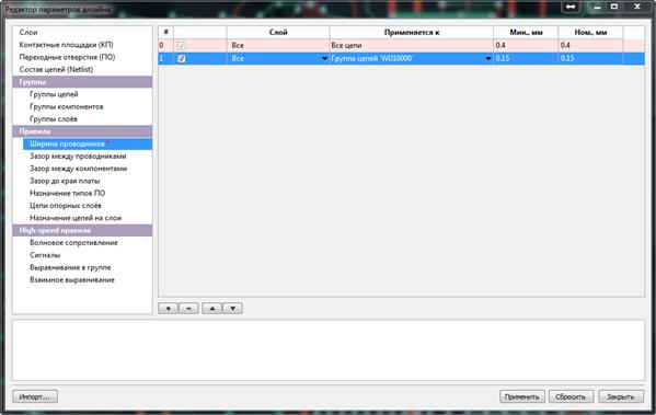 В Редакторе параметров дизайна можно настроить правила для ширины проводников и для зазоров между ними. Есть две графы: с минимальным значением и с номинальным.